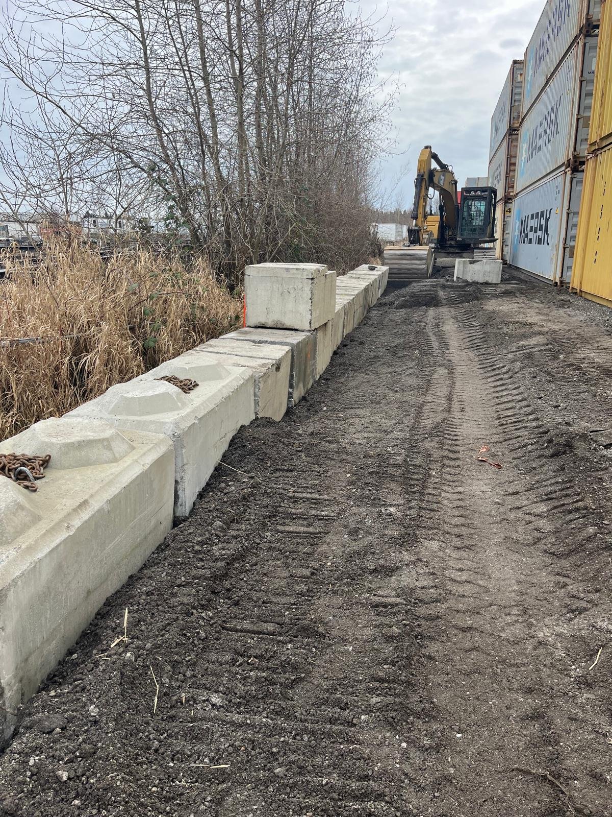 Cleaning and leveling an industrial yard and installing lock blocks on the perimeter of the yard.